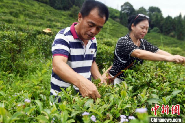 楊旻倫與妻子賴?yán)蚍荚诓枞~種植基地采摘茶葉 蔣雪林 攝