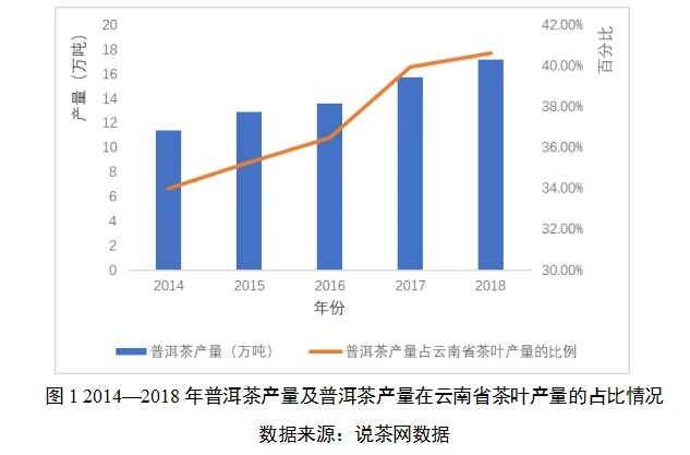 (一)產(chǎn)量持續(xù)增加。近五年來,普洱茶產(chǎn)量呈持續(xù)增加的趨勢,從2014年的11.4萬噸增長到2018年的17.2萬噸;普洱茶占比也不斷提高,從2014年的34.0%提高到2018年的40.6%。