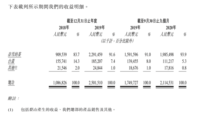 招股書顯示,2018年、2019年,奈雪的茶營業(yè)收入分別為9.1億元,22.91億元,2019年前三季度、2020年前三季度營收分別為15.92億元、19.85億元,2019年之后,該業(yè)務營收貢獻占營收總金額的比例提升至91%以上。