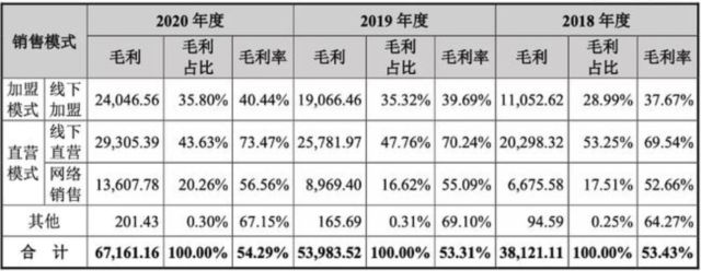 從銷(xiāo)售模式來(lái)看,八馬茶業(yè)采取的是“直營(yíng)+加盟”、“線(xiàn)上+線(xiàn)下”的全渠道銷(xiāo)售體系。截至2020年末,公司門(mén)店數(shù)量超過(guò)2000家,其中直營(yíng)店366家,加盟店超1700家。雖然,加盟店數(shù)量遠(yuǎn)超直營(yíng)店數(shù)量,但由于線(xiàn)下加盟模式的毛利率只有40%,遠(yuǎn)低于線(xiàn)下直營(yíng)模式73%的毛利率。因此,366家直營(yíng)店貢獻(xiàn)的毛利與超過(guò)1700家加盟店貢獻(xiàn)的利潤(rùn)大體相當(dāng)。
